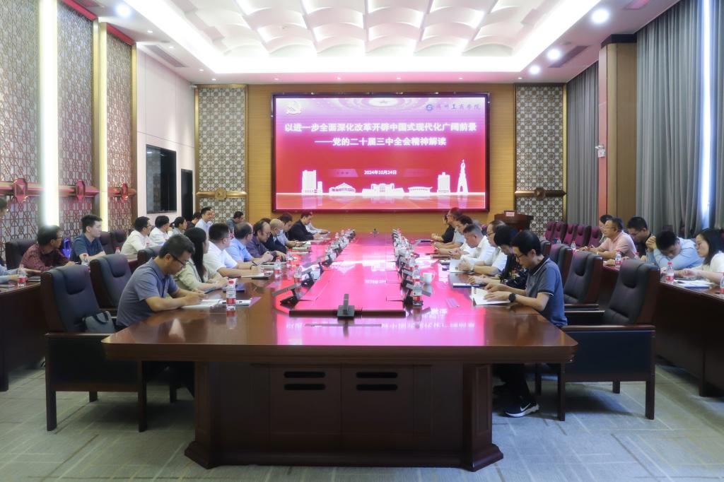 【本网讯】10月24日,kaiyun开云官方网站党委理论学习中心组举办“铸魂:精神谱系宣讲”报告会。“铸魂:精神谱系宣讲团”成员、“党的二十大精神”广东青年宣讲团讲师、广东财经大学马克思主义学院副院长孙晓晖教授进校作宣讲报告,主题为“以进一步全面深化改革开辟中国式现代化广阔前景”,传承红色基因,学思践悟中国共产党人精神谱系。学校党委理论学习中心组成员近50人参加。会议由学校校长王日华教授主持。