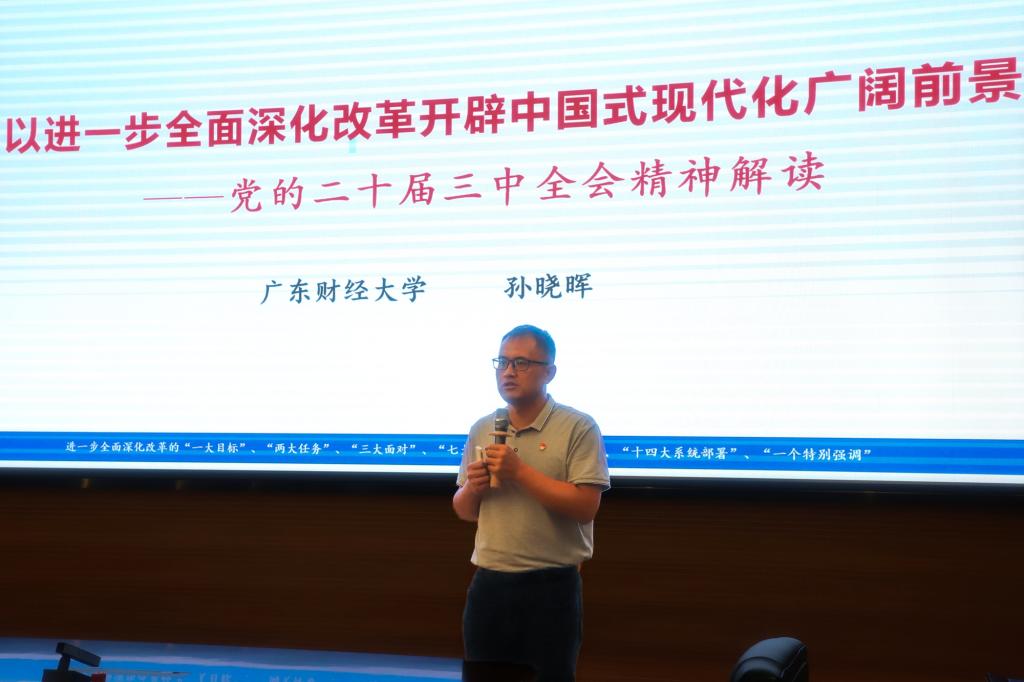 孙晓晖结合党的二十届三中全会精神,对全国改革开放精神和广东改革开放精神作深入解读。他从进一步全面深化改革的一个总目标与两大总任务、全面深化改革的“七大聚焦”、要贯彻的“六大原则”、十四大系统部署等方面作了主题报告,回顾了改革开放以来历次党的二十届三中全会精神,阐述了进一步全面深化改革的历史方位和价值意义、党的二十届三中全会的核心要义、如何更好地贯彻落实党的二十届三中全会精神。同时结合自身工作经历,以专业的知识、丰富的数据及接地气的阐释,紧密联系当前国内国际形势和经济、政治、文化、社会以及生态文明建设等领域,深入分析了进一步全面深化改革的卡点堵点和难点痛点问题,阐明中国共产党如何以全面深化改革开辟中国式现代化广阔前景。