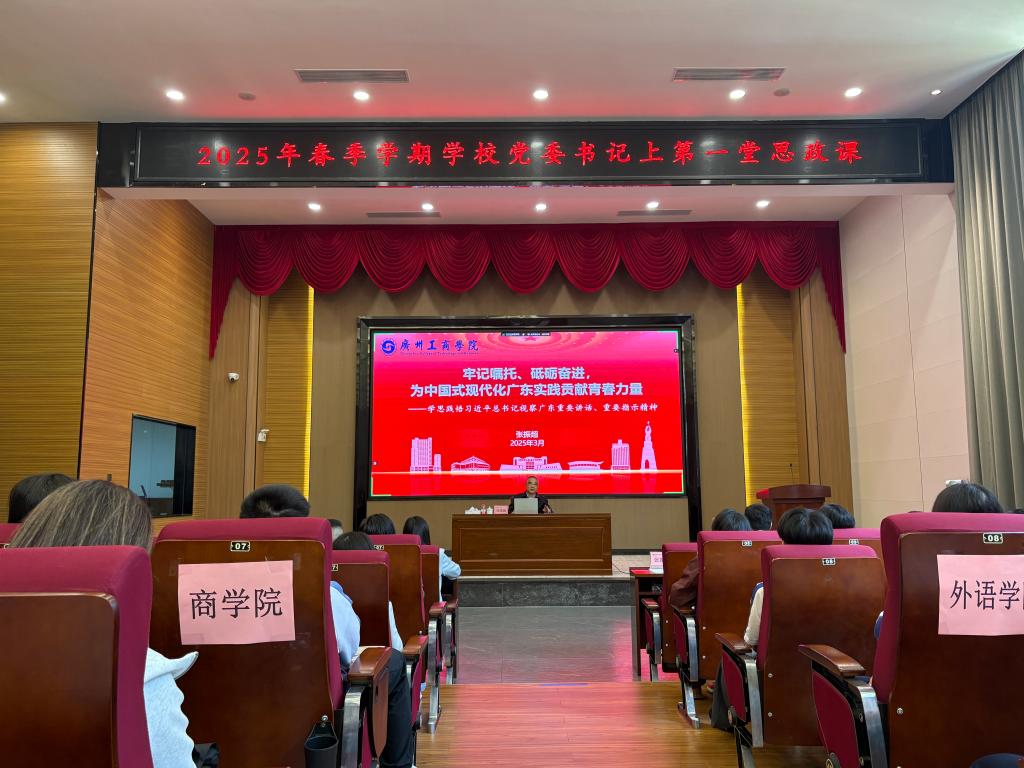 【本网讯】为深入学习贯彻习近平总书记关于学校思政课建设的重要指示精神,贯彻落实新时代学校思政课建设推进会精神,扎实落实《广东省教育厅关于做好2025 年春季学期大中小学校党组织书记、校长上第一堂思政课工作的通知》要求,3月21日下午,2025年春季学期第一堂思政课暨马克思主义学院思政大讲堂第61期在学校花都校区举行。本次活动主讲人为学校党委书记张振超同志,马克思主义学院常务副院长周静副教授主持。马克思主义学院教师代表、张辉名师工作室成员、辅导员代表与学生代表现场聆听授课。