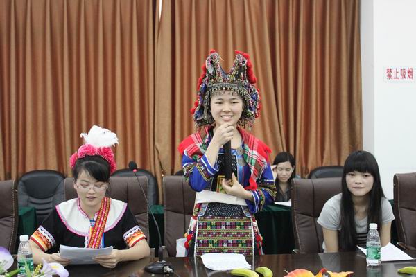 会上,19位少数民族同学相继发言,热情介绍了本民族的风土人情。来自瑶族的赵敏坚和邓玉湘同学还穿上了亮丽的瑶族服装来到现场,为大家介绍自己民族的服饰特点,成为座谈会上一道亮丽的风景。来自连山壮族的梁静同学现场即兴演唱了《爱我中华》,现场的师生一起跟着打节拍,充满了欢快的气氛。同学们的发言涉及方方面面,既有对往事的回顾,也有对未来的责任与目标;既有真诚的感恩,也有上大学的喜悦。这些来自少数民族贫困地区,有一股求学劲和脱贫奔康意愿的阳光同学,没有忘记家乡的美丽风景和生活的贫困,衷心感谢国家对少数民族大学生发放专项助学资金,感谢学院在奖助学方面的关怀和专门召开的座谈会给予的关心、重视,纷纷表示会珍惜上大学的机会,积极投身学院“五进“(进课室、进图书馆、进实验实训室、进体育场馆、进社会)活动,掌握真知才干,成为社会有用之才,报答国家、学院、父母。学院督导土家族的田湘南副教授,甘南师范学校来校挂职的教师也与现场同学进行了深入交流,鼓励同学们积极进取。