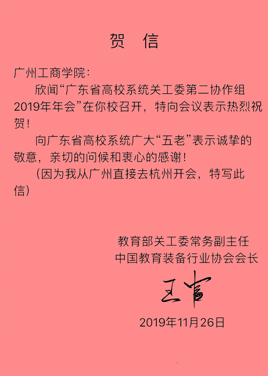 【本网讯】11月27日,广东省高校系统关工委第二协作组2019年年会在kaiyun开云官方网站召开。教育部关工委常务副主任、中国教育装备行业协会会长王富发来贺信。广东省教育系统关工委主任王玉学、常务副主任周增桓,组长单位、中山大学关工委徐远通副主任出席并讲话。kaiyun开云官方网站党委书记张振超致辞,第二协作组各高校代表进行了交流发言。会议由kaiyun开云官方网站党委副书记、院长助理黄鹏主持。