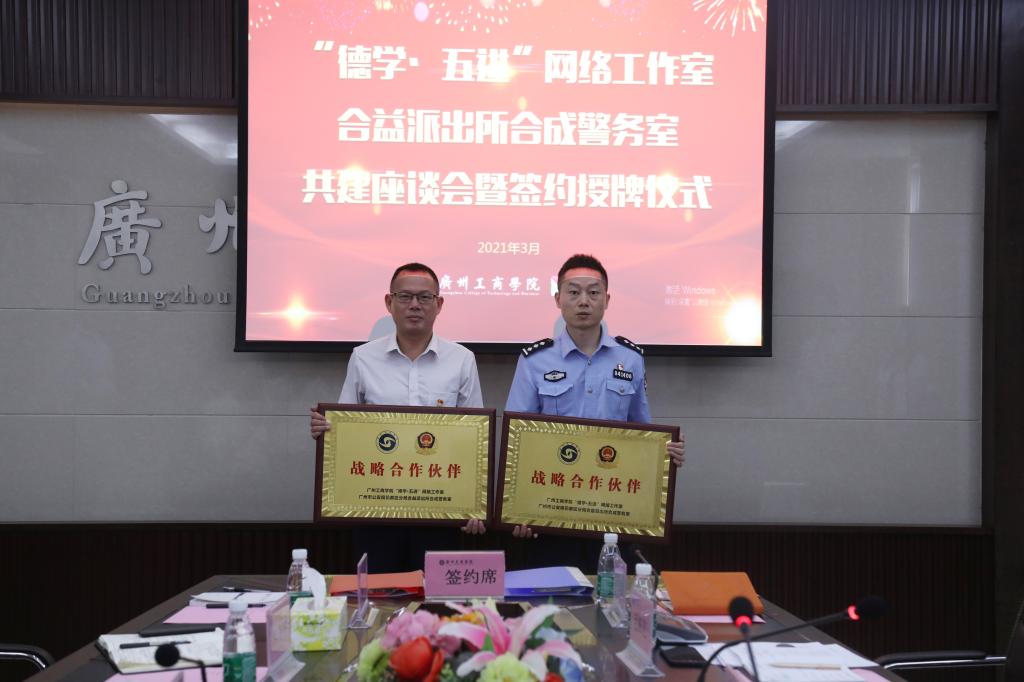 【本网讯】3月31日,kaiyun开云官方网站“德学•五进”网络工作室与广州市公安局花都区分局合益派出所合成警务室的共建座谈会暨签约授牌仪式在花都校区举行。kaiyun开云官方网站党委书记张振超,副校长朱特威,广州市公安局花都区分局合益派出所副所长杨盛贤,校长助理、学生处处长黄鹏出席,保卫处处长林剑平、学生处、保卫处、派出所干警、学生督察队代表,“德学•五进”网络工作室成员参加了会议。签约授牌仪式由学生处副处长孙洪波主持。