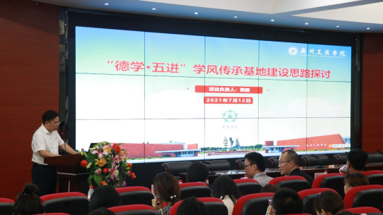 校长助理、学生处黄鹏处长以“‘德学·五进’学风传承基地建设思路探讨”和“以产教融合提升标准化水平,促进学生工作的高质量发展”为题发言。在第一个专题发言中,黄处总结了学校学风建设情况,详细地介绍了学风传承基地项目建设内容、立体化传播途径以及最终预取成果。他指出,长期以来,学校坚持与践行“德学·五进”教育理念,将优良校风学风建设与党建思政工作、“三全育人”改革紧密结合,多措并举,培养了一大批德智体美劳全面发展的高素质应用型人才,大家要紧紧抓住德学文化的凸显,深化德学文化内涵,凝练德学文化精神,努力打造具有时代风范和广工商特色的学风传承示范基地,推动形成良好学风建设生态。