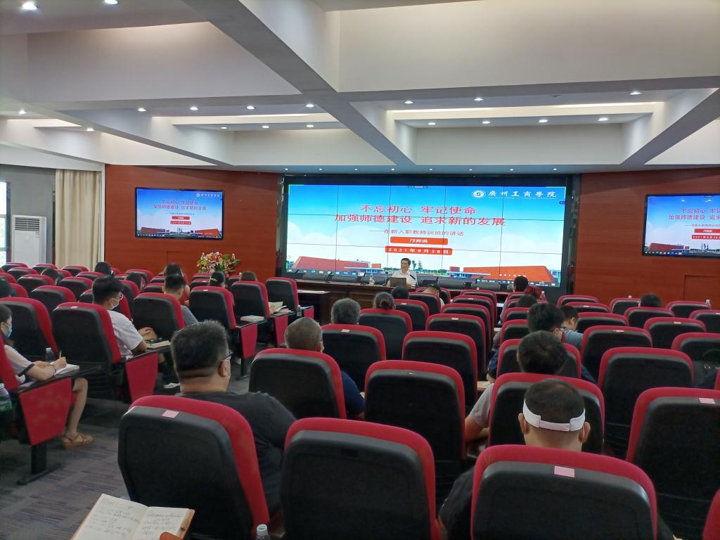【本网讯】为进一步贯彻“以德为行 以学为上”的教育理念,强化新入职教职工思想政治素质和师德师风建设,提升教职工教学科研能力、业务水平,深化学校“德学·五进”特色校园文化内涵,推动学校教学工作高质量发展,8月28日,学校在三水校区对新入职教职工进行了校内岗前培训,同时通过腾讯会议在花都校区分会场进行直播。