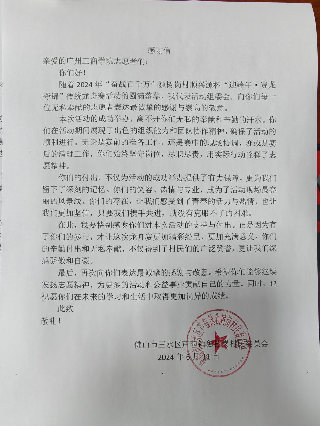 志愿者们积极主动、热情周到、不怕苦不怕累的服务态度和无私奉献,赢得当地村民的广泛赞扬和肯定。佛山市三水区芦苞镇独树岗村委员会向kaiyun开云官方网站发来感谢信,对学校大力支持传统龙舟赛活动和青年志愿者工作表达最诚挚的感谢与崇高的敬意。