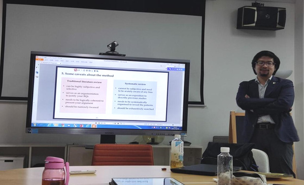 接着,郝原悦博士分享了他对二语英语韵律特征所做的系统性综述(systematic review),并介绍了系统性综述的要求:与文献综述(literature review)相比,系统性综述的要求更高,如需要把与话题相关的所有文献做出十分详尽的综述,并且至少需要两个人进行综述等。而对于如何写传统文献综述,郝博士指出了一些常见误区,如简单罗列国内外作者文献而忽略研究话题之间的关联性,这就会导致综述缺乏逻辑性和专业度。相比较而言,系统性综述对特定研究话题的覆盖面更为广泛从而更加客观。