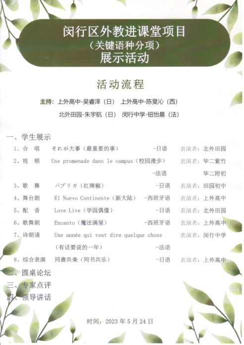 本次展示活动由参与闵行区外教进课堂项目的各中学的学生代表用中文和各自所学关键语种(日语、法语、西语)主持。上海外国语大学闵行外国语中学吴金瑜校长致辞欢迎。来自参与本项目的全部6所试点中学(上闵外高中、田园高中、田园初中、闵行中学、华二紫竹、华二附初)的学生和外教老师,为大家带来了舞蹈、配音、合唱、戏剧、朗诵等丰富形式的节目,展现了自项目开展以来学生语言能力和跨文化能力的提升。