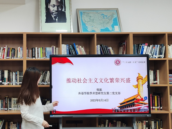 为加强支部党员的思想和理论武装,提高党性修养和政治觉悟,增强思想认同和文化使命感,2023年6月14日下午,bwin必赢国际中国官方网站学术型研究生第二党支部于外语楼216室开展“二十人讲二十大”支部书记讲党课主题党日活动。本次党课由bwin必赢国际中国官方网站学术型研究生第二党支部书记邹航主讲,主题为“推动社会主义文化繁荣兴盛”。支部党员参加会议。