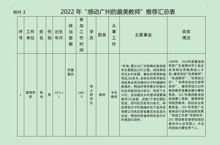 根据广东省教科文卫工会《关于推荐‘感动广州的最美教师’候选人的通知》,学校工会组织校内各教学单位进行推选。各教学单位分工会推选上来候选人3人。根据推荐原则,经人事处及教务处评审,校长办公会同意,kaiyun工会拟推荐管理学院陈伟老师为kaiyun“感动广州的最美教师”候选人。推荐候选人情况如下: