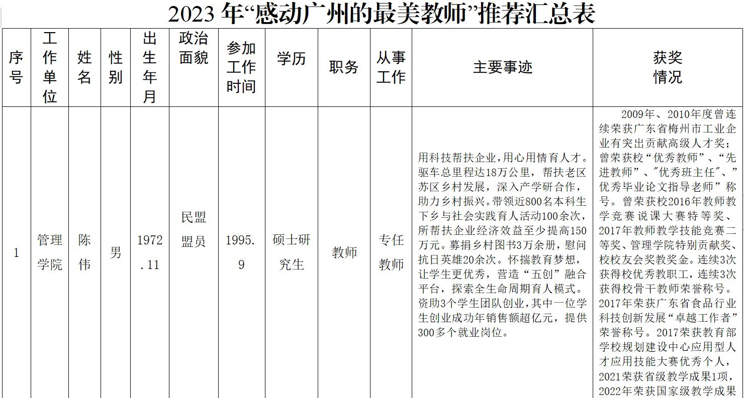 根据市教育局、市总工会、市文明办印发的《2023 年“感动广州的最美教师”系列宣传活动方案》精神,学校工会组织各教学单位分会进行推选。各教学单位分会根据推荐原则,共推选了4位教师。经学校工会、人事处、教务处评审决定,拟推荐管理学院陈伟老师申报2023年“感动广州的最美教师”。具体情况如下:
