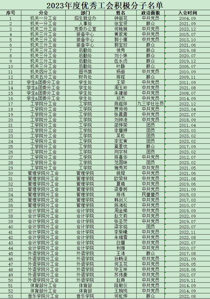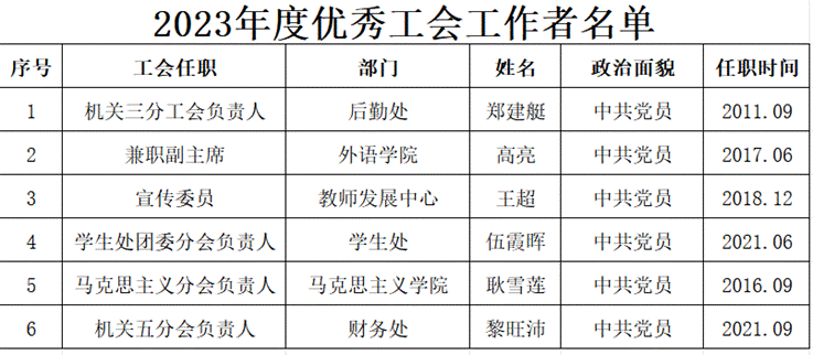 根据《kaiyun开云官方网站工会委员会关于评选2023年度“模范职工小家”“优秀工会工作者”“优秀工会积极分子”的通知》,学校各分工会积极申报“模范职工小家”和推荐了优秀人员名单。经相关部门进行资格审查后,最后确定2023年度“模范职工小家”2个、“优秀工会工作者”6名、“优秀工会积极分子”74名,具体名单公示如下: