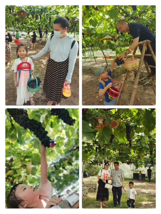 最后,教工们带孩子来到了葡萄园进行采摘。葡萄架上满眼翠绿下面挂着大串大串的紫葡萄,看得大家目接不暇,兴奋不已。精挑细选下,小朋友们在爸爸妈妈的帮助下,各自摘下了自己觉得最漂亮的那几串葡萄,欢天喜地的带回家。