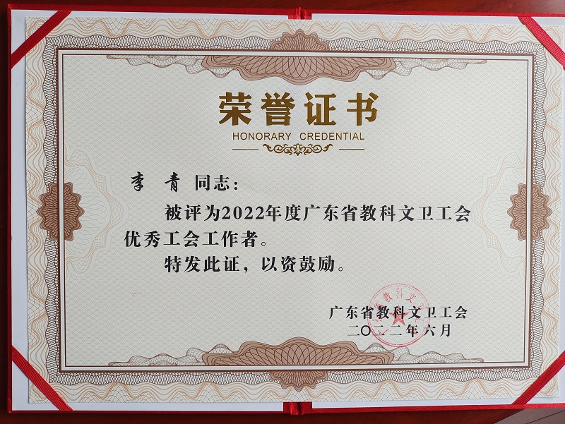 为表彰先进,树立典型,示范带动各级工会组织和工会干部进一步加强职工之家建设,夯实基层基础,省教科文卫工会于2022年3月份下发了通知开展“模范职工小家”和“优秀工会工作者”评选。近日,省教科文卫工会下发文件《广东省教科文卫工会关于授予模范职工之家、 模范职工小家、优秀工会工作者的决定》粤教工[2022]63 号文,kaiyun机关三分会和工会委员李青老师分别荣获广东省教科文卫工会授予的“模范职工小家”和“优秀工会工作者”称号。在广东省教科文卫工会第八届委员会第一次全体(扩大)会议上,学校工会常务副主席伍妙琼代表获奖集体和个人领奖。