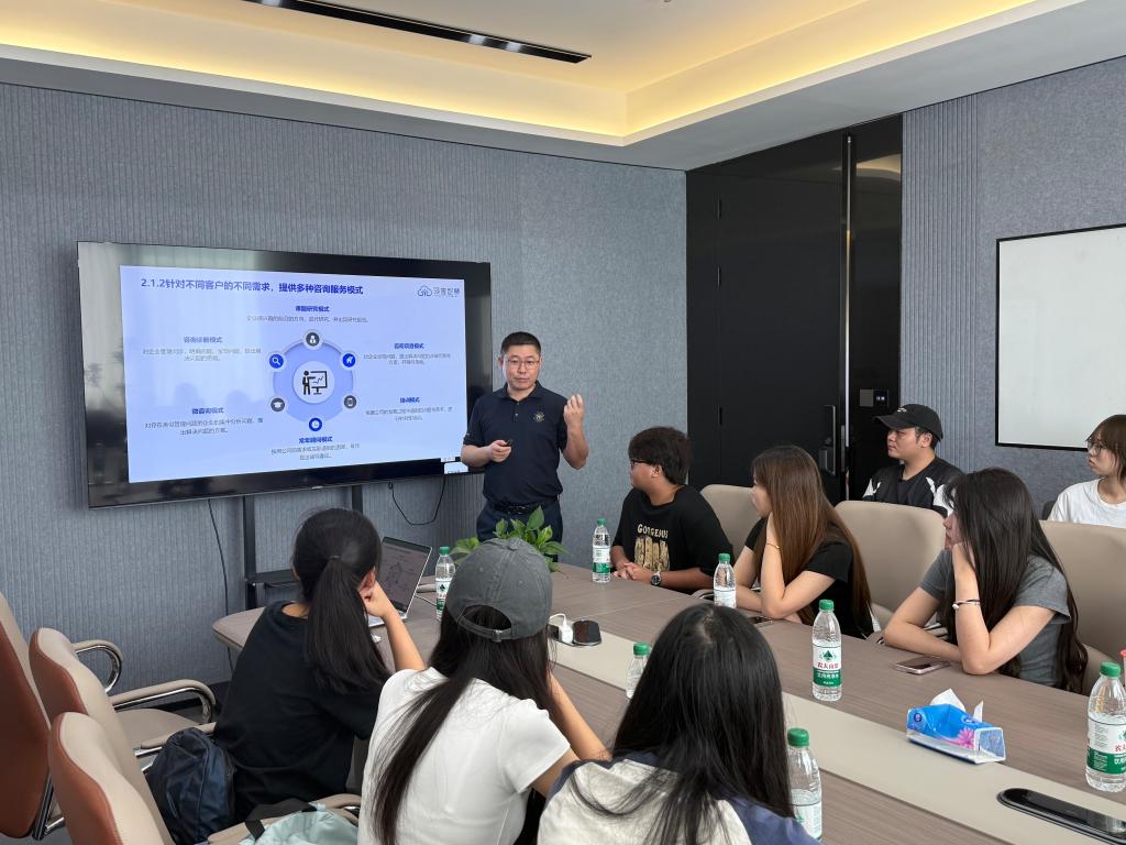 实习伊始,柳飞红老师为同学们详细介绍了领壹智慧的发展历程。领壹智慧自成立以来,凭借卓越的管理理念和创新的人才战略,在激烈的市场竞争中脱颖而出,逐步成长为集管理咨询、人才服务与系统研发于一体的一站式人才管理综合解决方案提供商。柳飞红老师强调,领壹智慧的成功离不开对人才的高度重视和科学管理,而人力资源管理的数字化转型则是其保持竞争优势的关键所在。