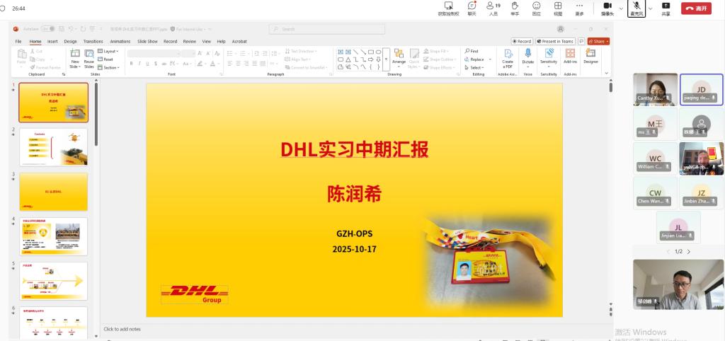 这9名物流管理专业学子于本学期初正式进入中外运-敦豪广东分公司实习,分别被分配至运营管理、客户服务、仓储配送、供应链规划等核心业务部门,在企业导师与学校老师的双重指导下,深度参与企业日常运营工作。此次中期汇报旨在全面复盘实习过半的学习成果,及时解决实习中遇到的问题,为后续实习工作的高效推进奠定基础。
