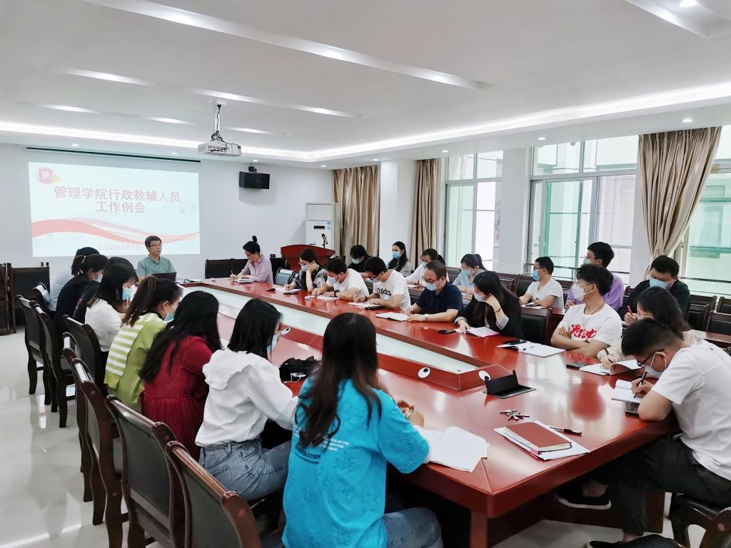 【本网讯】2022年4月7日,管理学院在院部楼211会议室召开行政教辅人员工作例会。会议由乔鹏亮院长主持,邹剑峰副院长、梁春树副院长及行政办公室、学生工作办公室和实验室全体老师出席参加。