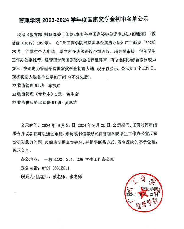 2023-2024学年管理学院拟推荐参评国家奖学金公开评选名单公示