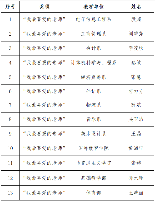 根据《关于做好2019-2020学年第一学期学生网上评教工作的通知》(广工商院教发〔2019〕114号)、《关于做好2019—2020学年第二学期学生网上评教工作的通知》(广工商院教发〔2020〕49号)工作安排,学校在评教活动进行的同时,开展了“我最喜爱的老师”评选活动。经学生评教,教学系(院、部)推荐,教务处、人事处形式审查,报院长办公会批准,段超等13位教师获本学年“我最喜爱的老师”荣誉称号,现将评选结果予以公示(教师名单见附件)。