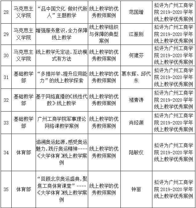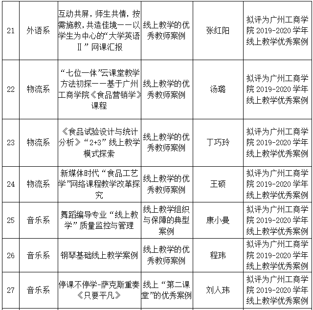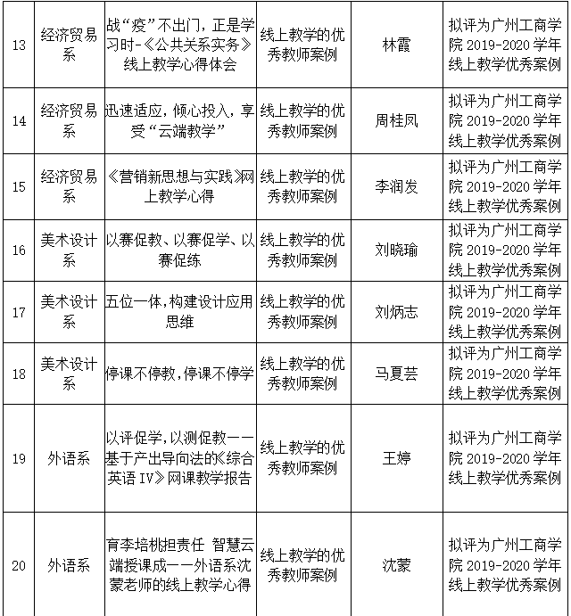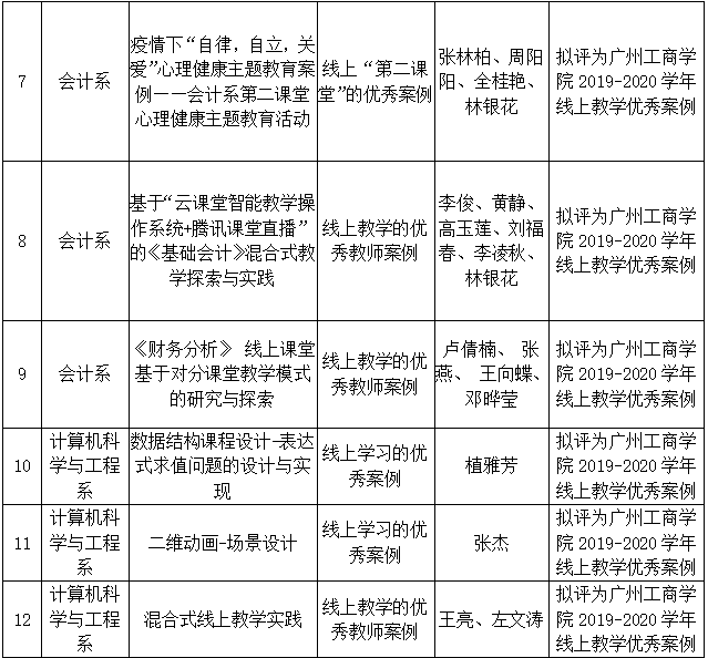 根据《关于征集疫情防控期间线上教学优秀案例的通知》的工作安排,经各单位提交材料、专家评审,经院长办公会审定,共评选出41项案例为“广州工商学院疫情防控期间线上教学优秀案例(第二期)”。现将评选结果予以公示(见附件)。