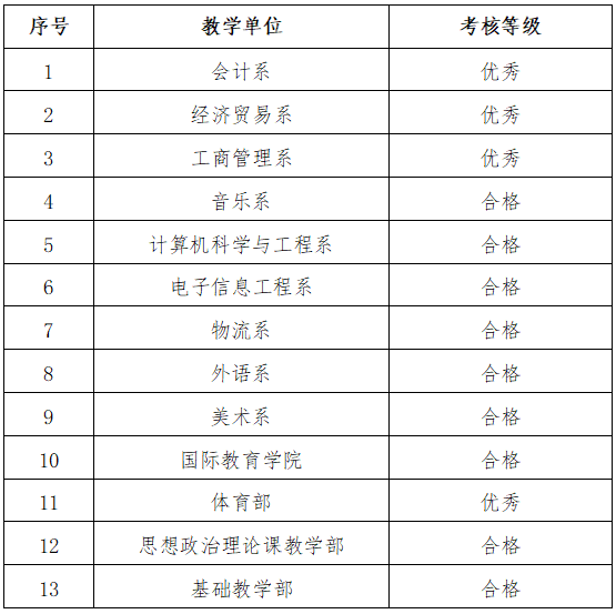 根据《关于做好2018—2019学年教学单位教学考核工作的通知》(广工商院发〔2019〕233号)要求,学院开展了2018-2019学年教学单位教学工作考核。经各教学单位自评、教务处形式审查、学院教学指导委员会评审、报院长办公会审批,会计系、经济贸易系、工商管理系、体育部四个教学单位考核结果为“优秀”,音乐系等九个教学单位考核结果为“合格”,程燕等十二位教学单位正副主任获得“2018-2019学年优秀教学管理工作者”荣誉称号(名单见附件)。现予公示。