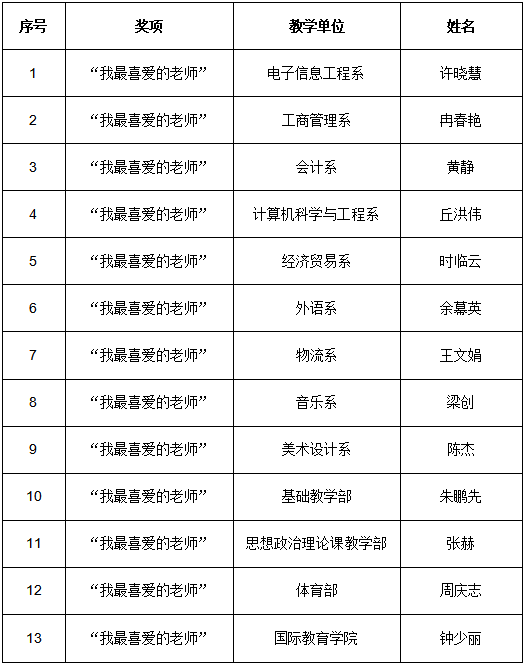 根据《关于做好2018—2019学年第二学期学生网上评教工作的通知》工作要求,学校在评教活动进行的同时,开展了“我最喜爱的老师”评选活动。经学生评教、专家评荐,报院长办公会批准,许晓慧等13位教师获本学期“我最喜爱的老师”荣誉称号,现将评选结果予以公示(教师名单见附件)。