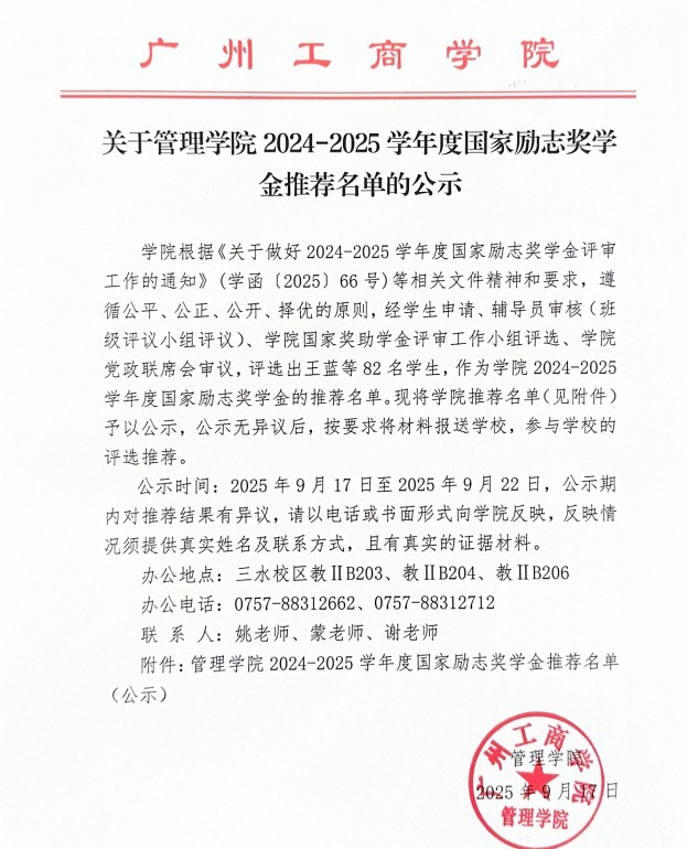 关于管理学院2024-2025学年度国家励志奖学金推荐名单的公示