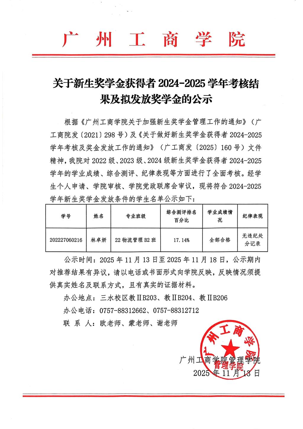关于新生奖学金获得者2024-2025学年考核结果及拟发奖学金的公示