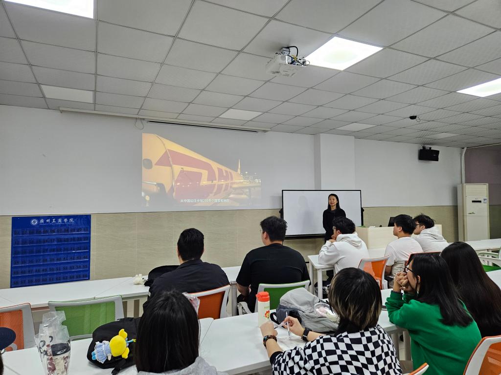 活动期间,中外运敦豪的四位高管结合自身岗位经验,带来了四场干货满满的专题分享。人力资源部人力专员何丽芳率先开讲,系统介绍了DHL广东分公司的发展历程、核心使命与独特企业文化,让学生对企业的运营理念与发展格局有了全面认知;口岸部清关组经理陈颖围绕清关业务展开讲解,既涵盖了通用清关流程,也重点介绍了DHL特有的清关模式与优势,为学生解锁了跨境物流的关键知识点;运输部门经理蔡魏聚焦货物快件运输中的风险管控,深入剖析了危险品识别、运输故障应对等核心问题,分享了企业成熟的解决方案与实战技巧;培训部主管余晓旋以“快件转运全流程”为主题,详细拆解了预约、调度、取件、离站、出口、转运、进口、入站及派送等关键环节,帮助学生理清物流运作的完整链路。