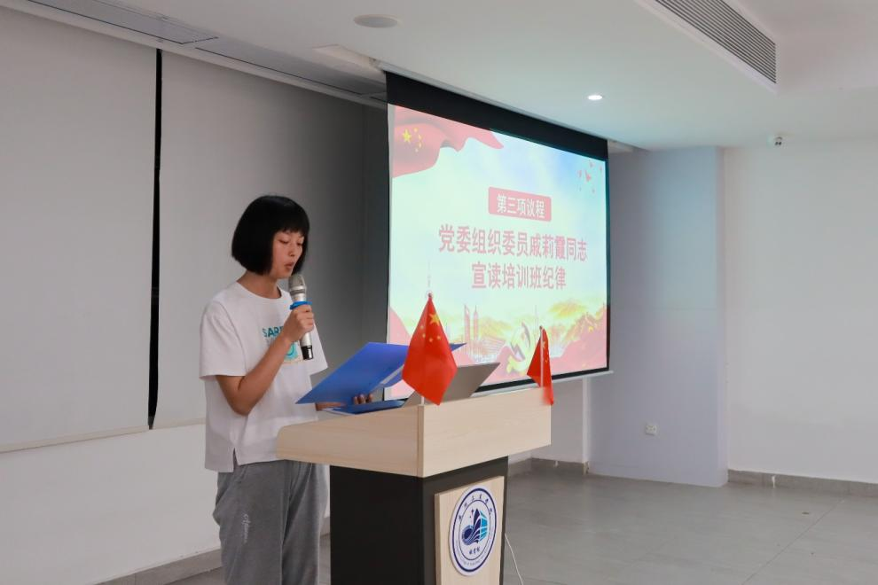 随后,由管理学院党委组织委员戚莉霞同志向学员们宣读培训班纪律。她明确表示,培训班学员们必须严格遵守法律法规和校纪校规,按时完成线上学习、专题党课、实践活动等各项培训任务。同时,戚莉霞同志对请假制度、结业考试要求以及违规处理规定等进行了详细说明,确保培训工作的严肃性和规范性,督促学员们要珍惜培训机会,认真学习党的理论知识,不断提升自身党性修养。