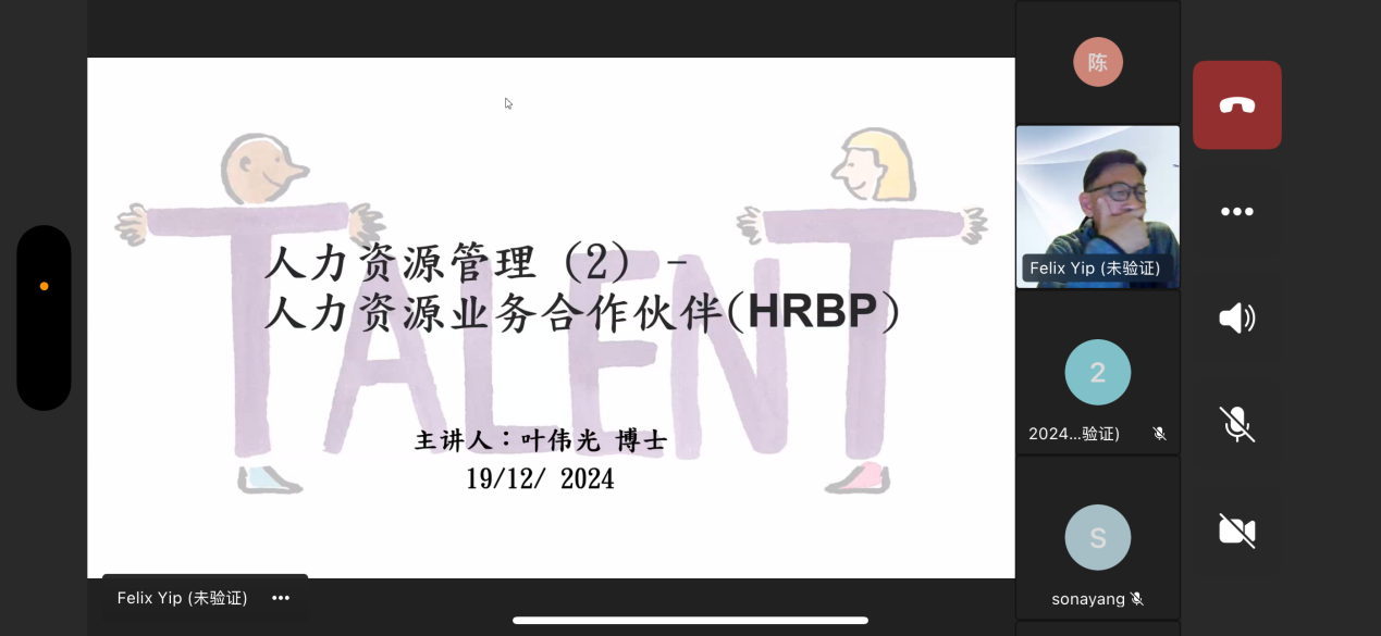 【本网讯】近日,kaiyun开云官方网站管理学院迎来了一场高水平的线上讲座,主题为“人力资源管理——人力资源业务合作伙伴”。本次讲座邀请了香港理工大学商学院客席讲师、曾任香港浸会大学人力资源管理学商学士(荣誉)课程主任的叶伟光博士(Dr Felix Yip)担任主讲嘉宾。讲座吸引了众多管理学院学生的热情参与,由陈泽宇老师担任主持人,确保了活动的顺利进行。