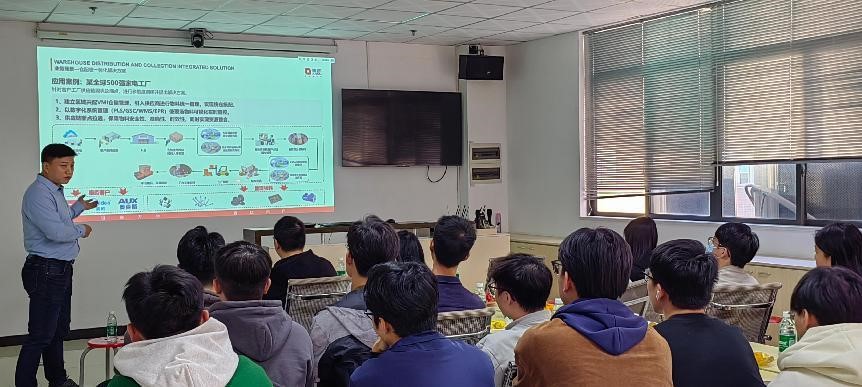 参观结束后,骏都物流供应链公司吴良春副总经理为学生们举办了一场主题为“数智化技术引领创新、推动高质量大发展”的讲座。吴总,工科学士,中山大学EMBA,既懂技术又懂管理,分享了骏都如何积极迎接企业数智化转型挑战,聚焦智能家电产业链集群,延伸新能源汽车、家具、冷链物流等产业链集群,不断创新商业模式。同时他也鼓励同学们要珍惜在校学习机会,不断学习、不断提升自我。