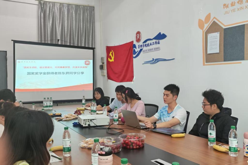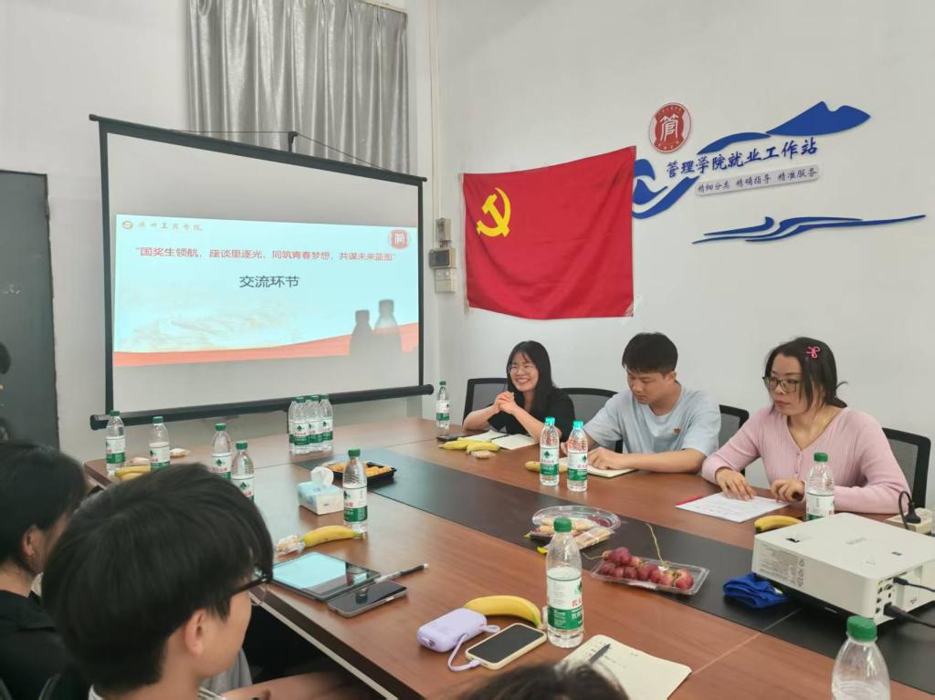 【本网讯】为激励管院学子在综合素质提升的征程中勇毅前行,帮助他们锚定奋斗目标,以国奖生为榜样汲取奋进力量,进而推动学院国家奖学金工作稳健良性开展。2025年3月27日,管理学院“梦・享・家”一站式学生社区联合社区功能型党支部、学生第二党支部于三水校区管理学院一教B202就业指导工作站举办“国奖生领航,座谈里逐光,同筑青春梦想,共谋未来蓝图”主题座谈会。座谈会由主要负责国奖业务的张永训老师主持,管理学院学工办副主任谢丽星老师、团委书记欧荣林老师以及各年级学生代表共同出席。