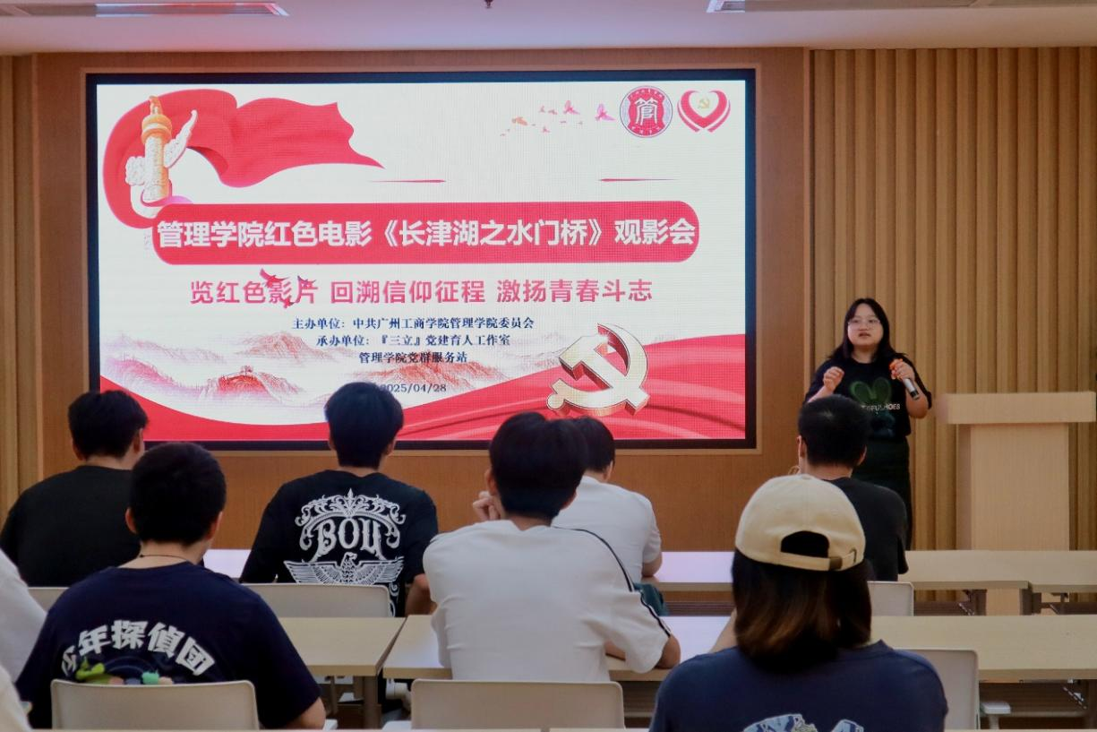 【本网讯】为深入学习贯彻党的二十大精神,进一步弘扬爱国主义精神,传承红色基因,激发广大师生的爱党爱国情怀,管理学院党群服务站于2025年4月28日19:00在三水校区图书馆六楼新时代党员讲习所开展“一月一观影”活动,现场近60名师生共同观看抗美援朝题材影片《长津湖之水门桥》。在光影交织中,师生们穿越时空,重温那段波澜壮阔的峥嵘岁月,深刻感悟志愿军战士们的英勇无畏与崇高精神,汲取奋进新时代的磅礴力量。