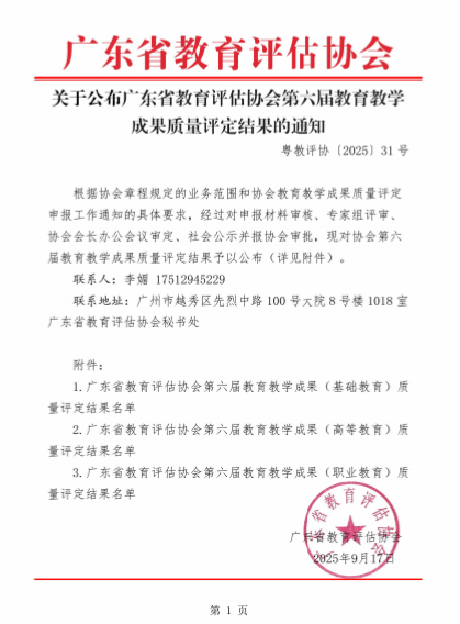 近日,广东省教育评估协会正式公布第六届教育教学成果质量评定结果。我院推荐申报的三项教学成果全部获奖,包括一等奖1项、二等奖2项,展现了我院在教育教学改革与实践方面的显著成效。
