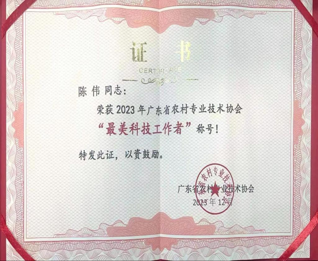 kaiyun管理学院高级工程师、高级技师陈伟副教授因在产教融合与科技服务乡村及企业工作中,成绩表现突出,被广东省农村专业技术协会评为2023年度“最美科技工作者”荣誉称号,证书由广东省科协事业发展中心主任叶世豪亲自颁发。