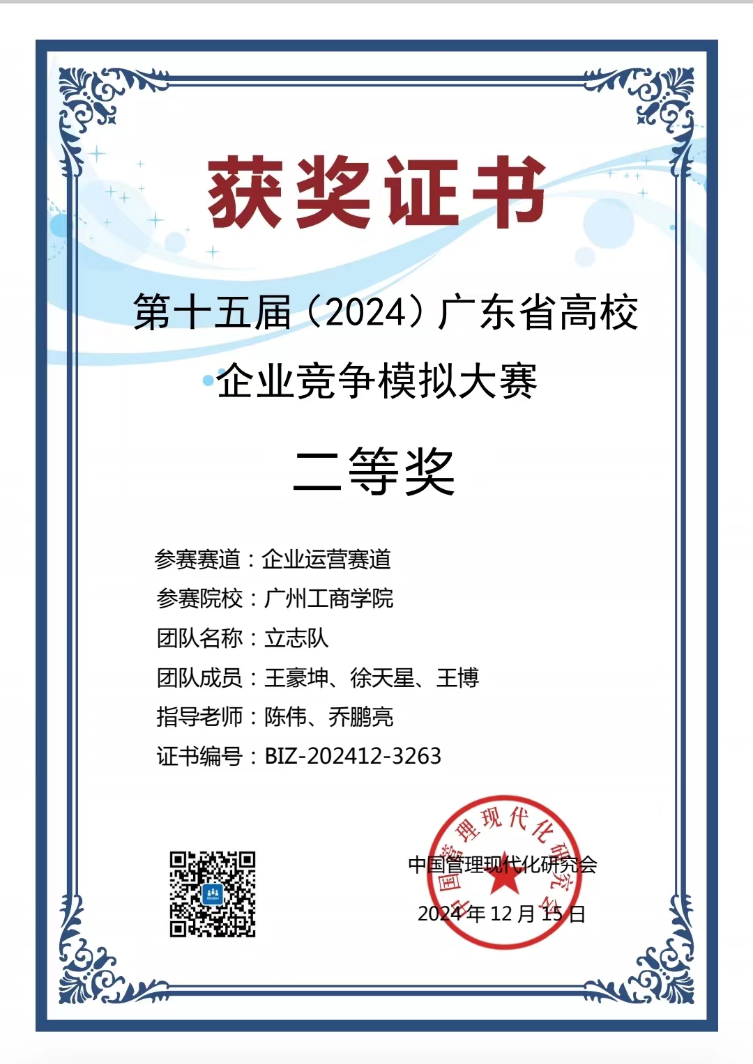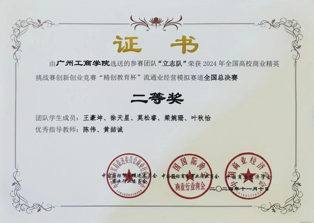 立志队(成员:王豪坤、徐天星、王博;指导老师:陈伟、乔鹏亮)在第十五届(2024)广东省高校企业竞争模拟大赛企业运营赛道中荣获二等奖。