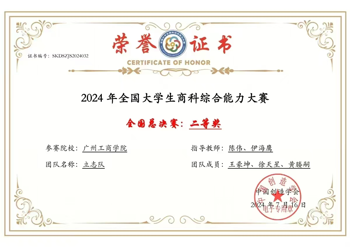 2024年7月16日,2024年全国大学生商科综合能力大赛全国总决赛闭幕,立志队(学生:王豪坤、徐天星、黄媵嗣 ;指导老师:陈伟、伊海鹰)喜获2024年全国大学生商科综合能力大赛全国总决赛二等奖。