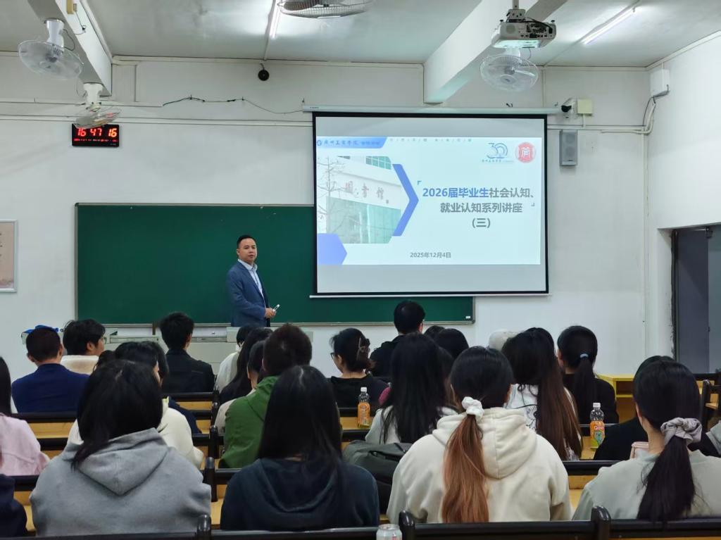【本网讯】12月4日,第三期毕业生社会认识与就业认知专题讲座在第一教学楼D504室成功举办。本次讲座特邀佛山广州圣天科教有限公司创始人、资深人力资源专家杨春林先生担任主讲,为2026届毕业生带来了一场关于“从校园到职场的华丽转身”的深度分享。讲座直面当前“学生就业难、企业招人难”的结构性矛盾,系统剖析了毕业生人数持续攀升、平均起薪承压的现实挑战。杨春林先生结合自身丰富的职业履历与招聘经验,从“现状认知”出...