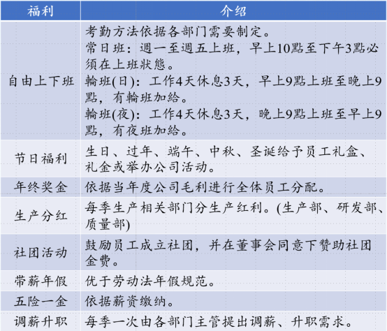 (生产红利、年终奖金及节假日奖金另计,其余公司福利如下)