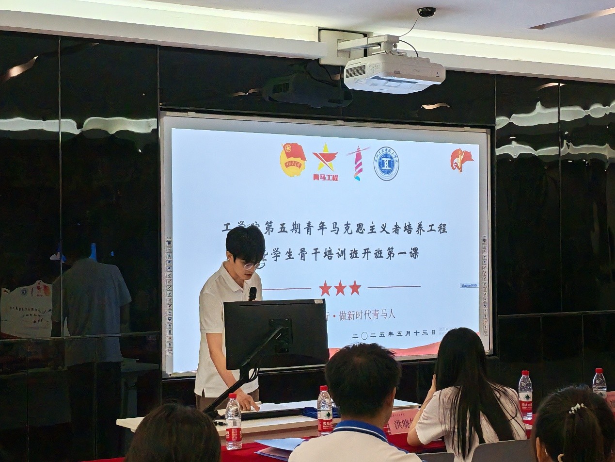 【本网讯】为提升青年学子的思想觉悟、理论素养、创新思维、实践本领与协作能力,为党培育和输送一批政治信仰坚定、家国情怀深厚、理论基础扎实、综合能力突出,能担重任、德行服众的青年骨干力量,5月13日晚上,我院于第一实验楼C201举行工学院第五期青年马克思主义者培养工程暨学生骨干培训班开班仪式。出席本次活动的嘉宾有:工学院学工办主任张渊超老师,工学院学工办副主任郭婷婷老师,工学院团委书记马宇翔老师,工学院团委书记处助理李诗柳,工学院学生会主席团成员廖丽芬、洪晓娟、徐子铭。