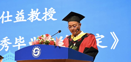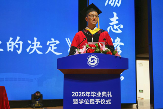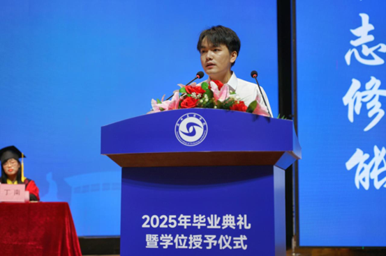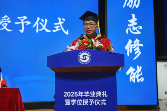 毕业生代表郑濠滨同学发言,感谢了老师们的辛勤教导和同学们的陪伴支持,表示大学时光是人生中宝贵的财富,无论选择何种道路,都要保持独立思考、热爱生活,用奋斗实现梦想,将大学的收获转化为未来前行的动力。