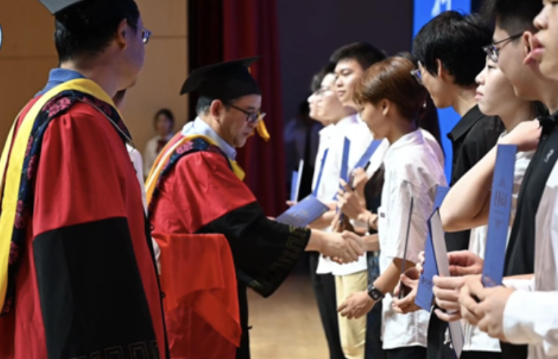学士学位授予仪式上:学位评定委员会为2025届本科毕业生授予学士学位证。毕业生们上台接受导师的拨穗,领取学位证书并合影留念。