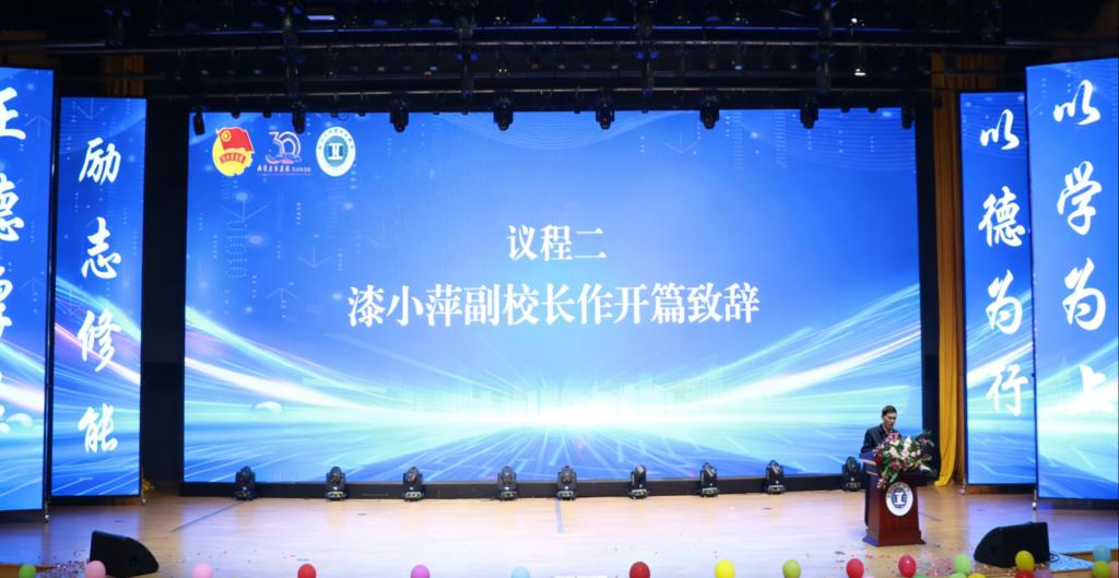 大会在庄严的国歌声中拉开帷幕。学校副校长漆小萍作开篇致辞。他首先向受表彰同学表示热烈祝贺,向辛勤耕耘的全体教职工致以崇高敬意。漆校指出,三十年来学校始终秉持“德学五进”育人理念,工学院作为中流砥柱,在人才培养、学科建设等方面成果显著。他寄语全体学子:要以榜样为标杆,校准人生航向;以实干为根基,锤炼专业本领;以初心为引领,培育高尚品德,将个人理想融入国家与学校发展大局。