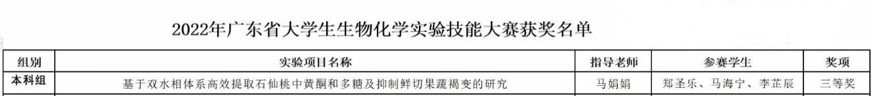 11月27日,由广东省教育厅主办、华南农业大学承办的第二十一届广东省大学生生物化学实验技能大赛总决赛近日落下帷幕,由我院食品专业马娟娟博士指导,郑圣乐、马海宁、李芷辰组成的参赛团队项目《基于双水相体系高效提取石仙桃中黄酮和多糖及抑制鲜切果蔬褐变的研究》荣获大赛三等奖,这是kaiyun首次组织参加此项赛事,就成功进入决赛,取得三等奖的佳绩,实现了食品专业学子在广东省生化技能竞赛中零的突破!