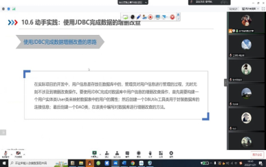 课堂上,谢可祯老师以案例引入教学内容,对上次课内容的知识点进行巩固讲解,在创设情境中导入新课《使用JDBC完成数据的增删改查》,通过案例讲解新的知识点,讲练结合,以提问等方式进行师生互动。