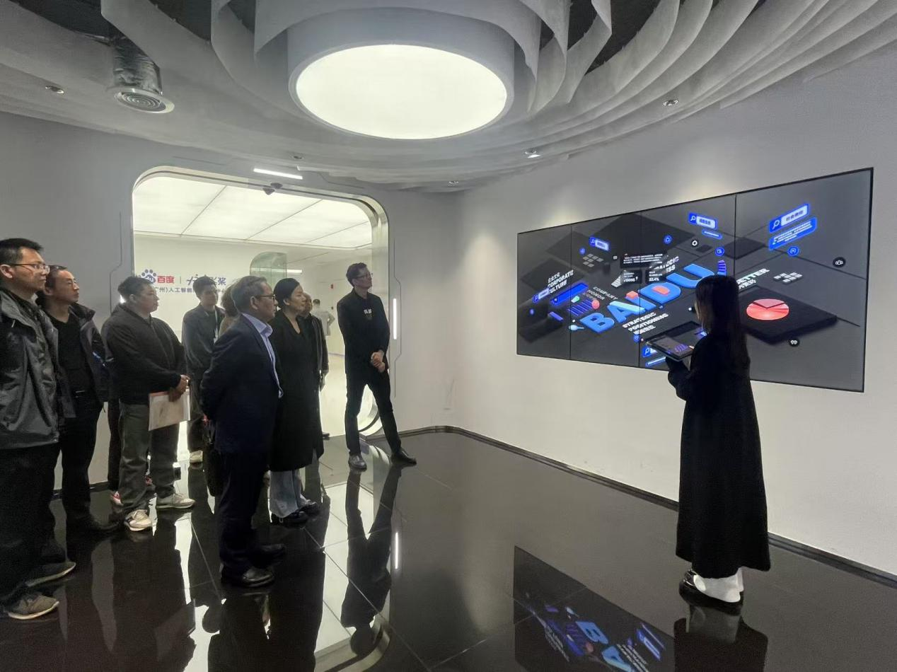首先,调研团队参观了百度飞桨中心展厅。展厅全面展示了百度飞桨在人工智能领域的最新技术成果及跨行业应用案例。教师们通过展厅内丰富的展品、互动体验区和数字人等前沿科技体验,对百度飞桨平台的人工智能技术应用有了更直观且深入的认识。