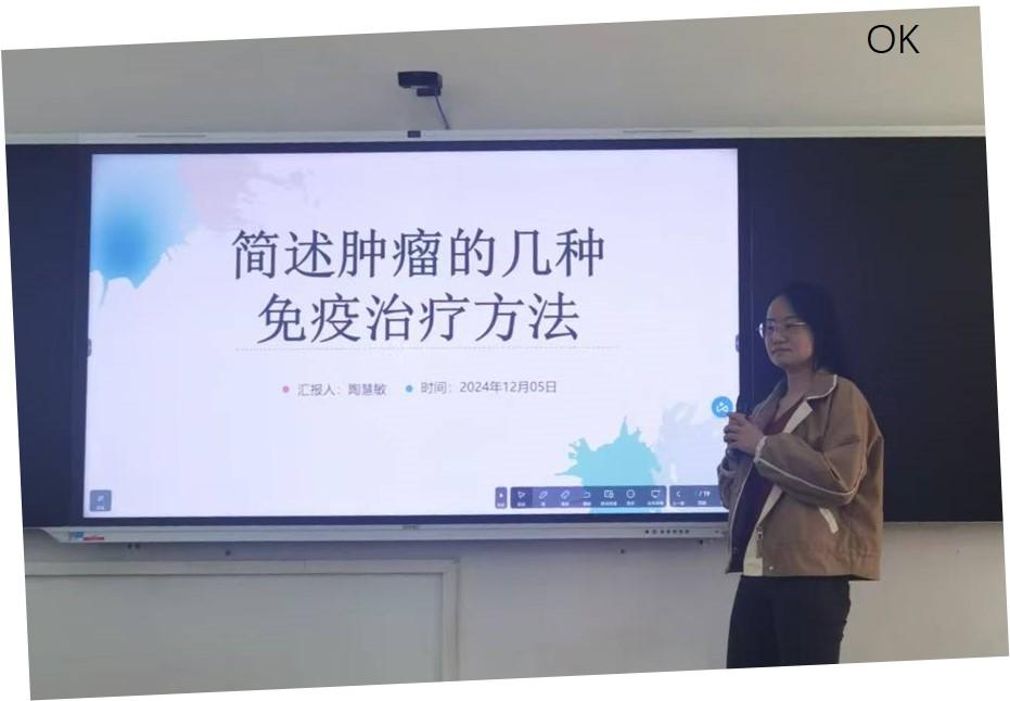 第三位汇报人为陶慧敏博士。陶老师于华中科技大学获得博士学位,专业为生物化学与分子生物学,研究方向主要为肿瘤免疫和肿瘤的联合治疗。陶慧敏老师有十多年的国内外科研工作经历,此次汇报的题目为《简述肿瘤的几种免疫治疗方法》。陶老师今天比较详细和有条理地汇报了其各阶段的研究方向和内容,其研究内容涉及黑色素瘤、鳞状细胞癌、乳腺癌、肝癌、B淋巴瘤和头颈癌等多种肿瘤,以及其联合治疗和机制的研究。陶老师的研究还涉及到造血干细胞在肿瘤的髓系偏移研究和造血干细胞在妊娠期的红系偏移研究。