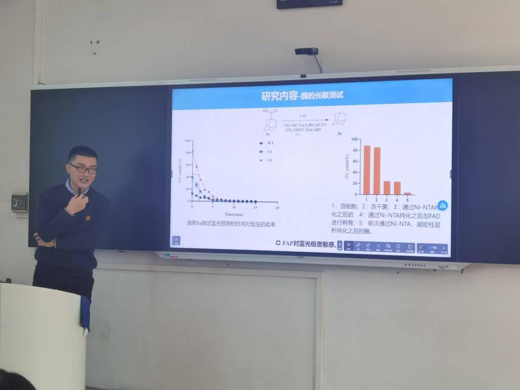 第二位汇报老师为郑杰博士。郑老师于西北农林科技大学获得博士学位,专业为化学生物学,研究方向为光促酶的研究。郑博士汇报的题目为《光促酶催化自由基脱羧反应的研究》。郑老师的博士阶段研究内容是对天然的脂肪酸光脱羧酶进行定向进化改造,拓宽了光酶催化的底物应用范围,同时也首次将此酶成功地应用到α-CH3类羧酸的进行手性拆分,最后还将酶的动力学实验与分子动力学模拟相结合以解释突变体与野生型之间的差异性。