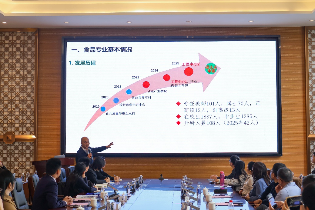 随后,欧仕益教授向嘉宾详细介绍了工学院食品与营养学科建设情况,系统梳理了学院食品学科的发展历程、现有基础、成果与特色优势,客观分析了当前面临的机遇与挑战,并围绕“十五五”规划要求,从学科方向凝练、平台建设、团队培育及产学研融合等方面,提出了清晰的未来发展思路与实施路径,为学科建设锚定了前进方向。