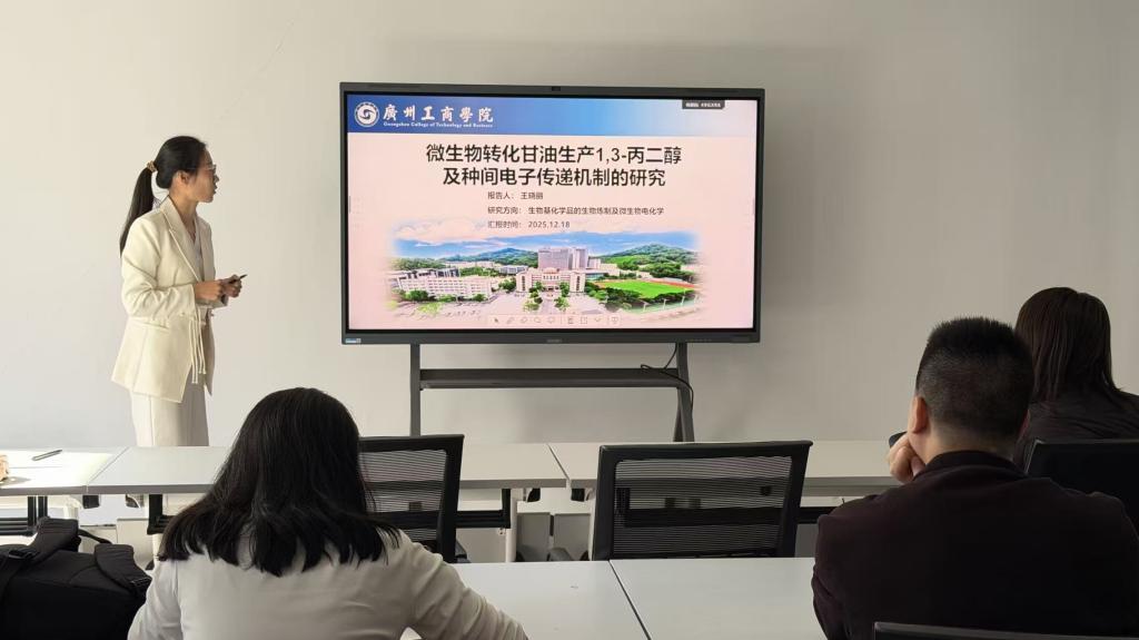 王晓丽博士以《微生物转化甘油生产1,3-丙二醇及种间电子传递机制的研究》为主题,汇报了其在微生物转化粗甘油生产1,3-丙二醇(1,3-PDO)及种间电子传递机制方面的系统研究,展示了该领域从基础研究到产业化应用的过程。研究围绕生物柴油副产物——粗甘油的资源化利用展开,针对传统1,3-PDO生产中存在的产物浓度低、发酵过程不稳定等问题,通过筛选获得高效稳定的微生物菌群及单菌,并进一步优化发酵条件,成功将1,3-PDO产量提升至超过100 g/L,达到了目前报道的自然菌生产1,3-PDO的最高浓度。同时,研发了序列接种、三级连续发酵、CO₂原位固定联产等多套新型发酵工艺,实现了从半连续到全自动连续生产的升级,相关技术已部分应用于企业生产线建设。在机制研究方面,通过多组学联合分析,解析了关键维生素对甘油代谢的调控作用。此外,创新性地构建了发酵菌Clostridium pasteurianum与多种产电菌共培养体系,初步揭示了种间互作对发酵菌1,3-PDO合成的促进作用,为构建发酵菌与产电菌共培养提供了新思路。